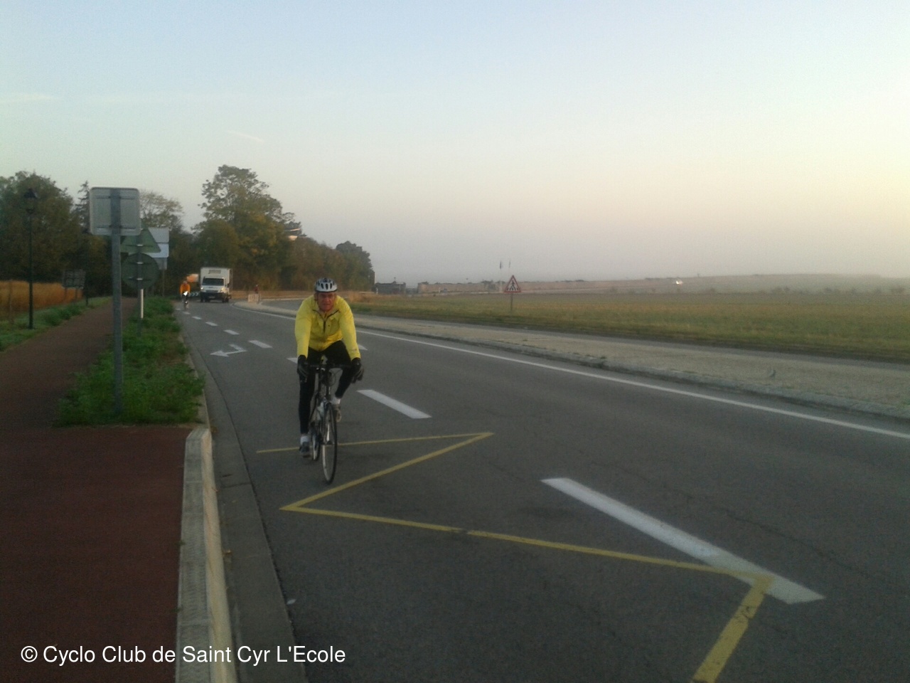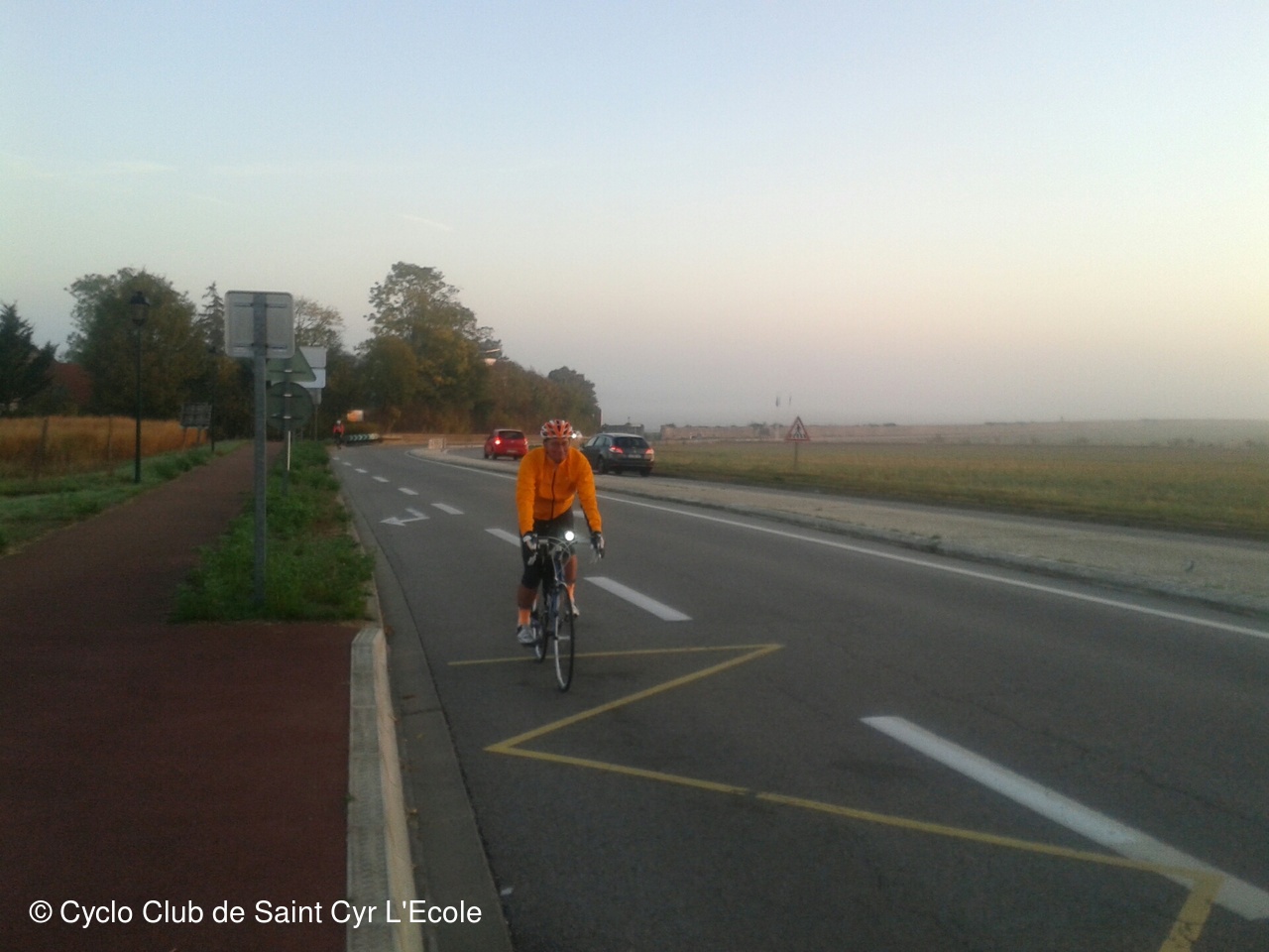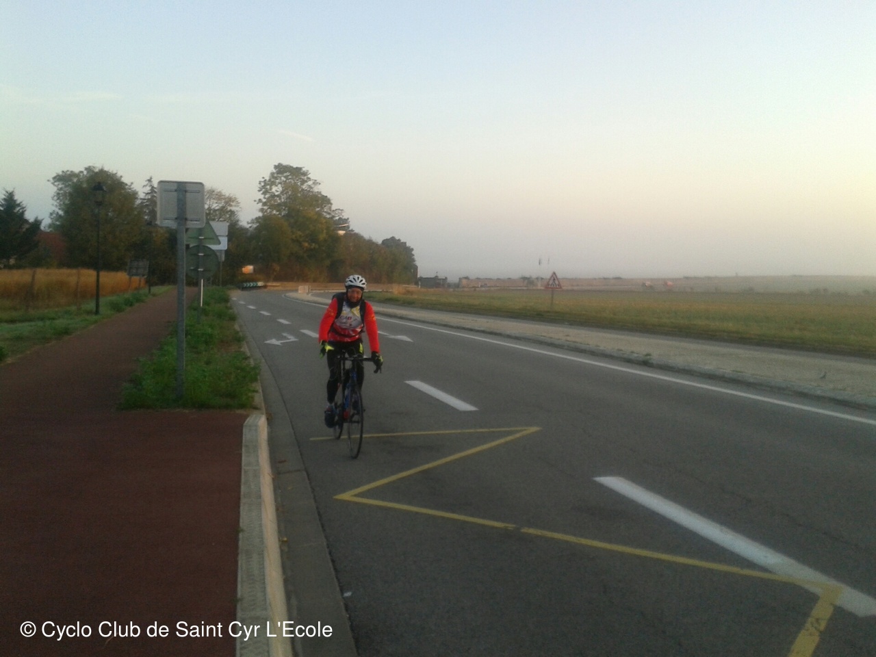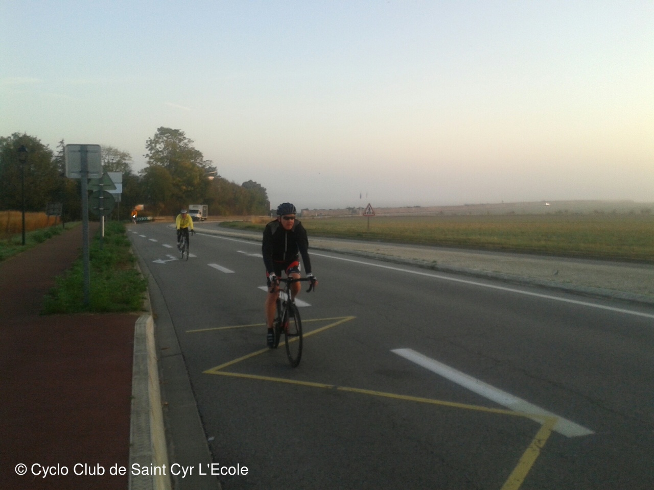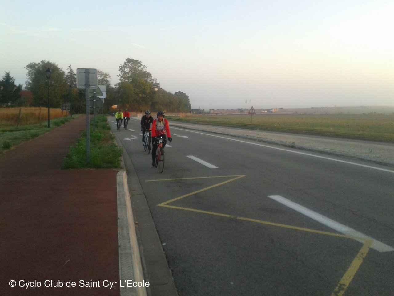 Une petite halte pour nous regrouper en haut de la cote qui nous amène vers Thiverval, nous a permis découvrir que la température n'était que de 1 degrés, et que le broullard dans la descente sur Beynes collait aux lunettes rendant la visibilité quasi nulle..