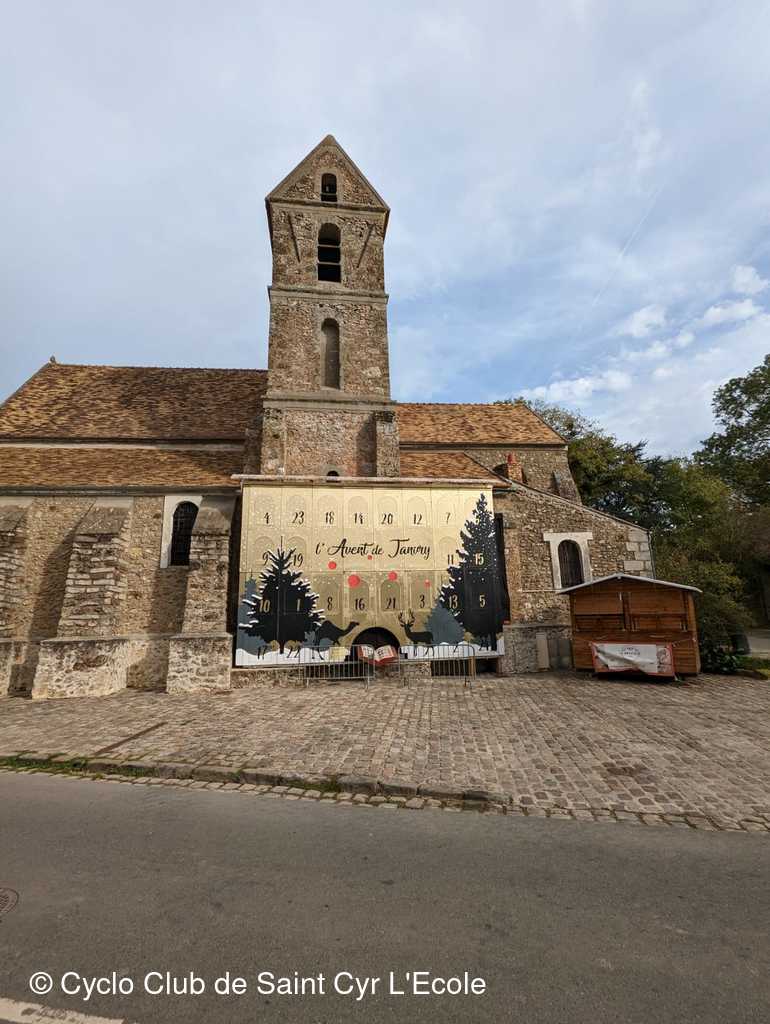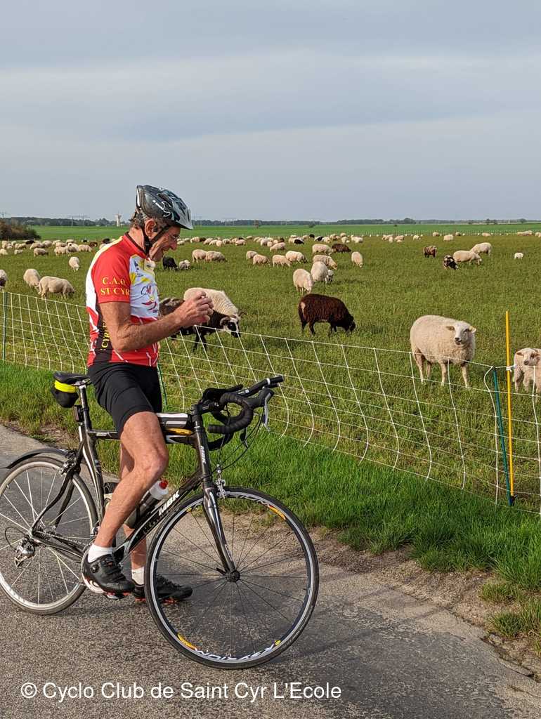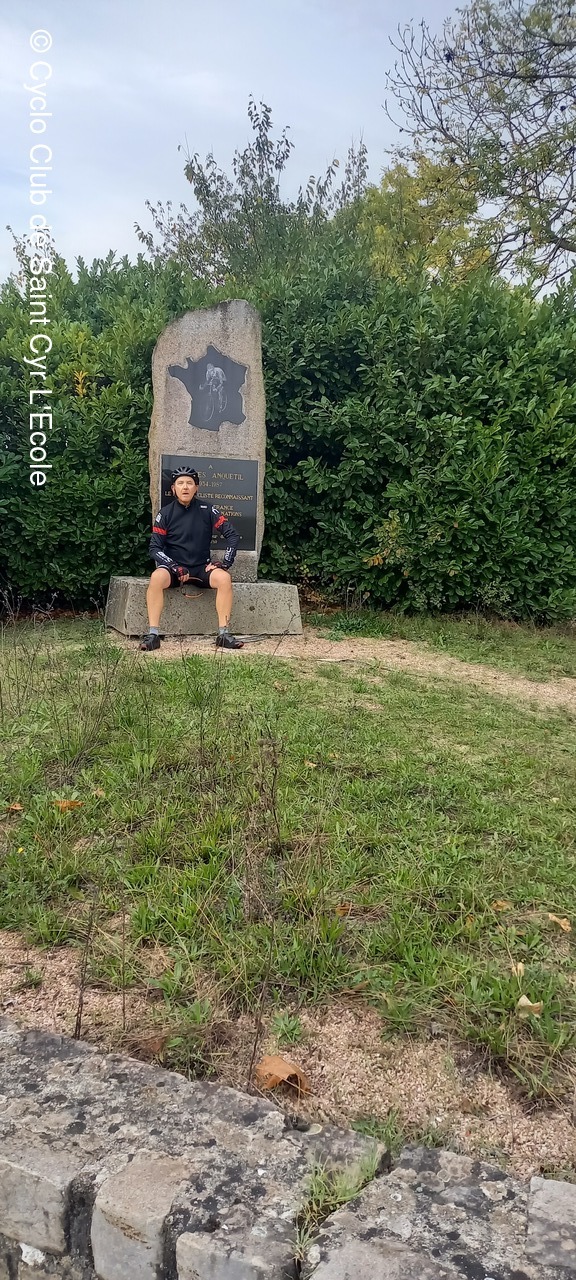 Et là, non ce n'est pas JY qui a crevé, mais Sylvain qui perd une cale de sa chaussure. Reste une seule vis. Réparation faite nous continuons notre randonnée vers Limours, Janvry, Gometz, Chateaufort avec un recueillement de JCW sur la stèle à la mémoire d'Anquetil..