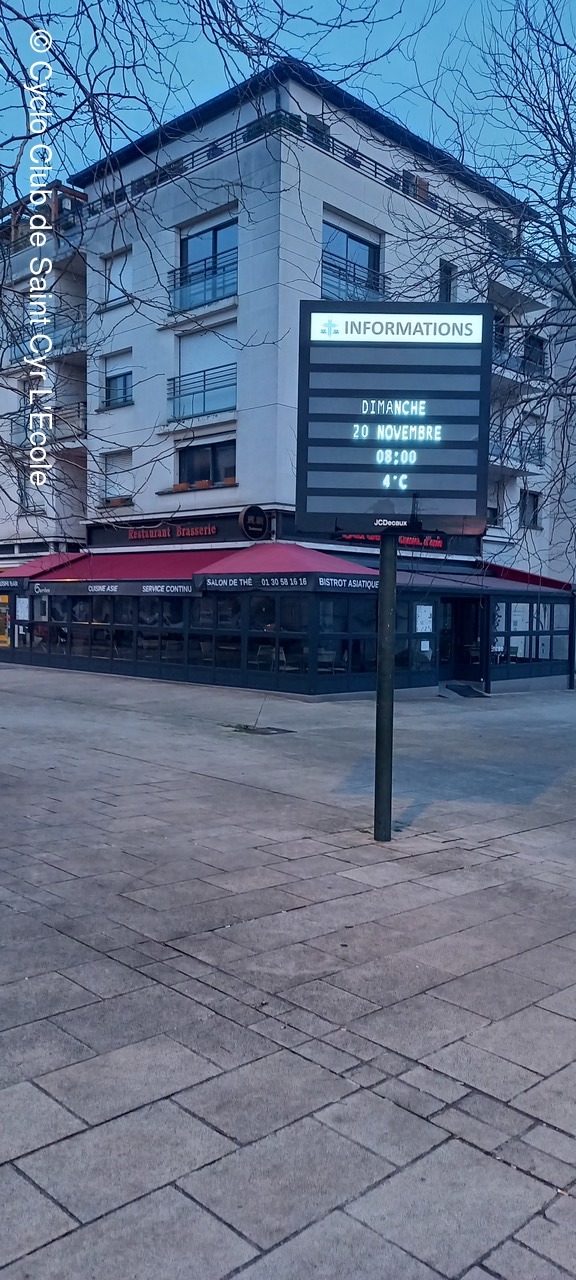La fin de parcours vers Maule, Mareil, puis la cote du vol à voile de Beynes avec quelques petites gouttes de temps en temps, nous à fait arriver à St Cyr à 12h10. J'avais 75 km à mon compteur.