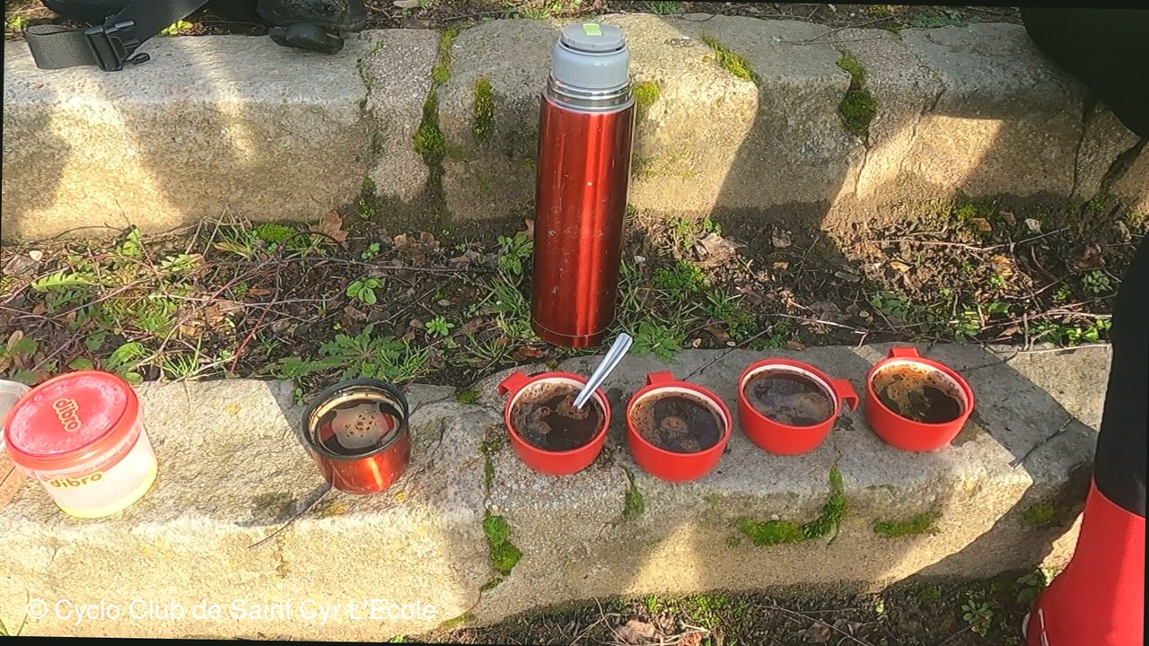 Poursuite du chemin sur Orgeval et après avoir passé Les Alluets nous avions prévus une halte dans un petit abri à l’entrée d’Herbeville, mais dans la logique des ennuis, il était déjà occupé par d’autres cyclos. C’est donc dans le village  que nous faisons notre pause-café dans un petit parc bien sympathique. Traversons Crespières  et rejoignons  la côte toute droite de Thiverval à l’extérieur du village. Et c’est en s’arrêtant pour attendre le regroupement au rond-point qu’en regardant parterre, je découvre que ce que je pensais être un morceau de plastique et  est en fait  un ordinateur Dell que l’on a eu bien du mal a caser dans le sac à dos vu que le café prenait déjà la place. Donc on se partage tout le nécessaire de café pour mettre l’ordi dans le petit sac à dos.