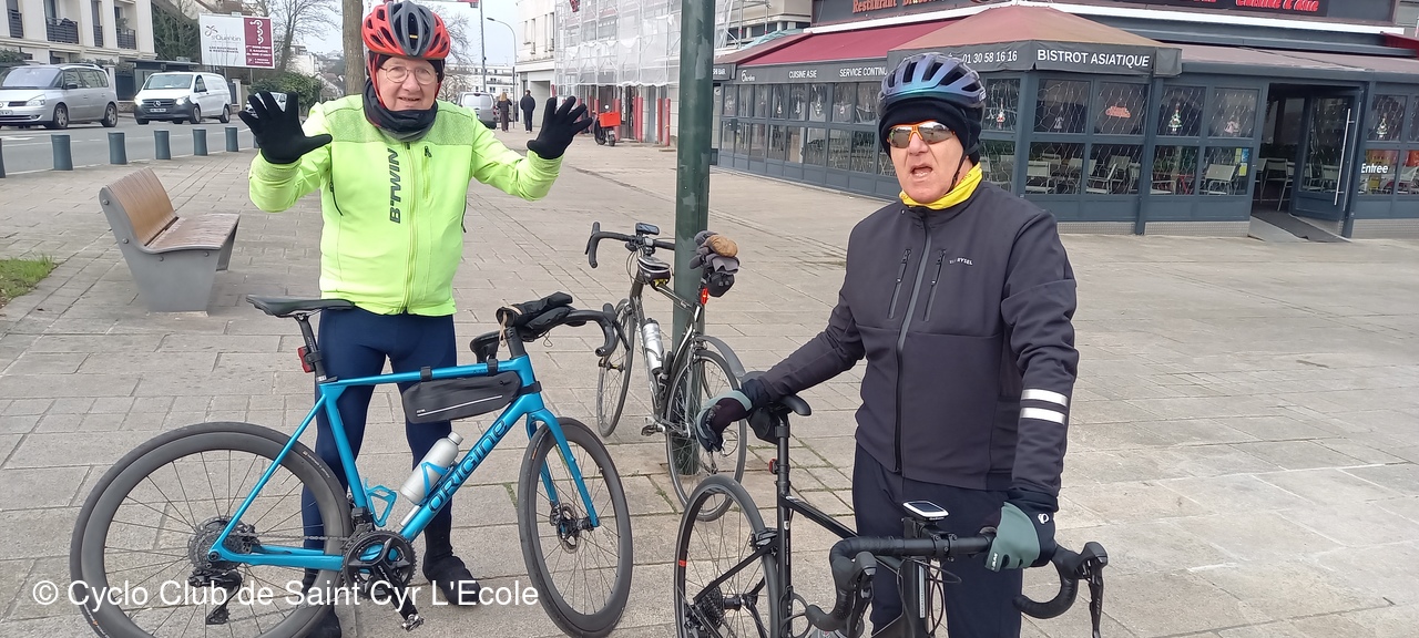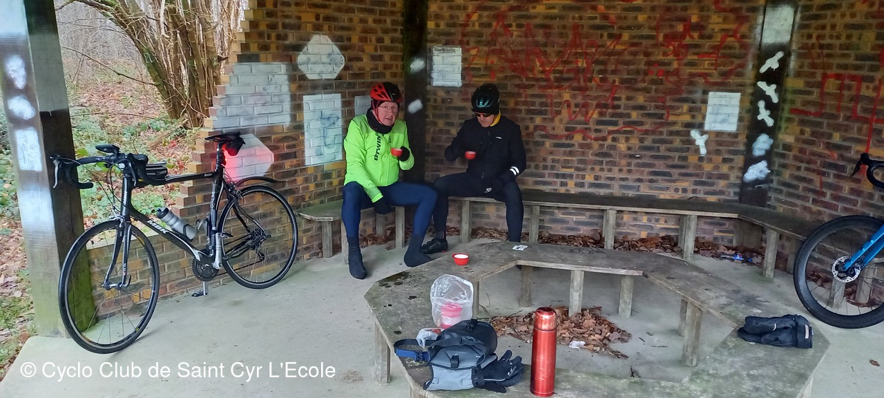 Bien entendu la roulante nous accompagnait pour nous alimenter en café chaud que nous avons pris en 1er lieu au Flambertins bien à l'abri dans le petit abri. Puis continuant la route vers Crespières puis Thiverval ou l'on a fait la 2ème pose réchauffement sur la piste après la cote de Thiverval.